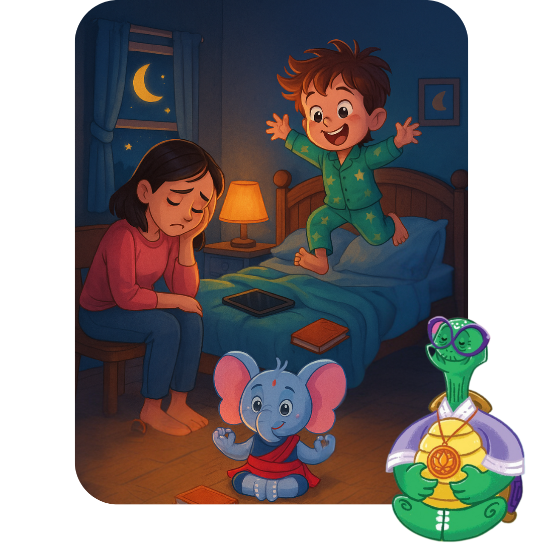 Uma jornada mágica que ensina crianças a respirarem, se acalmarem e entenderem seus sentimentos — enquanto você transforma a hora de dormir em um ritual de conexão e paz.